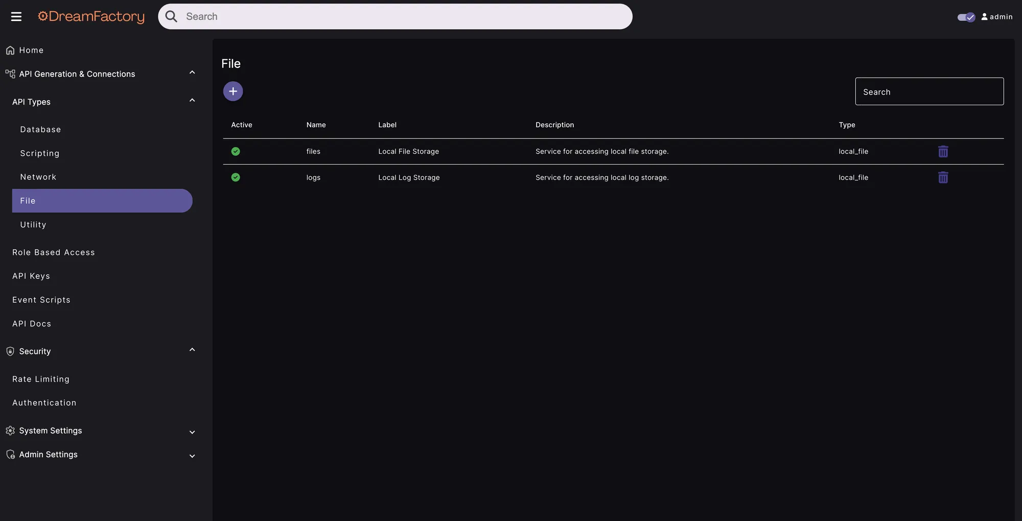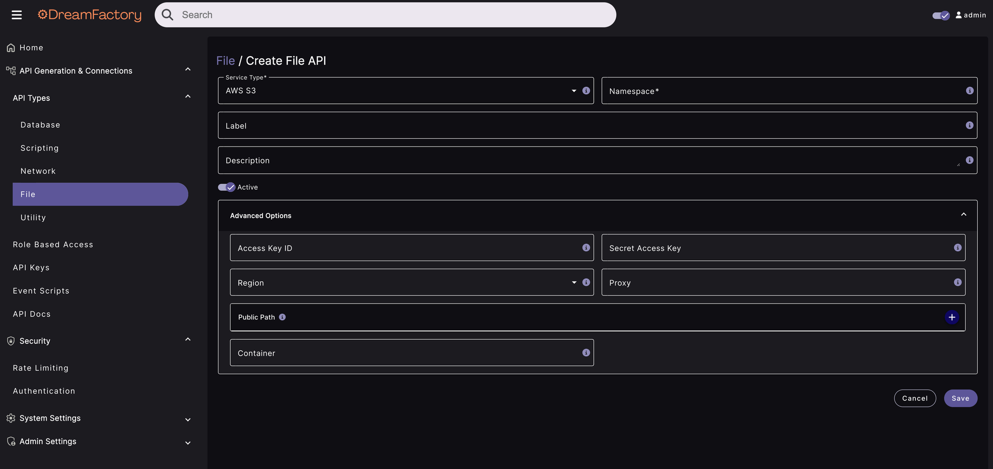 To commence generating your Amazon S3 REST API, you’ll login to the DreamFactory administration interface, navigate to API Generation & Connections and then enter the service creation interface by clicking on the File dropdown button under the API Types submenu.
