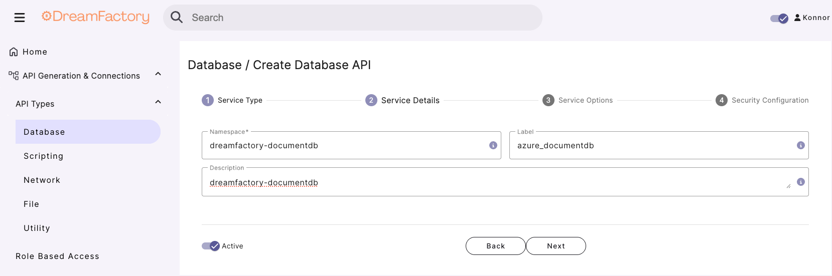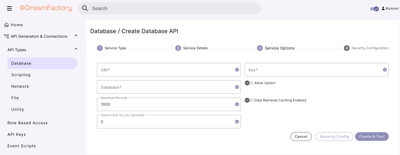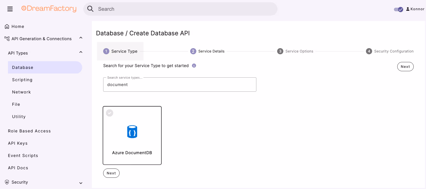 To commence generating your CosmoDB REST API, you’ll login to the DreamFactory administration interface, navigate to API Generation & Connections and then enter the service creation interface by clicking on the Database dropdown button under the API Types submenu.