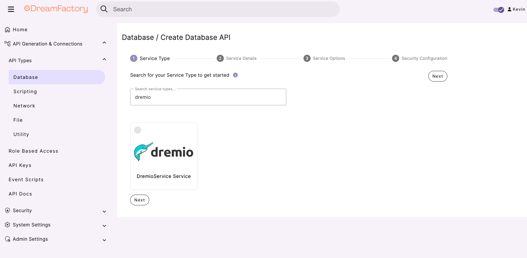 Click API Types, select Database, create a new connection with the plus (+) button, and choose Dremio as the service type from the dropdown menu.
