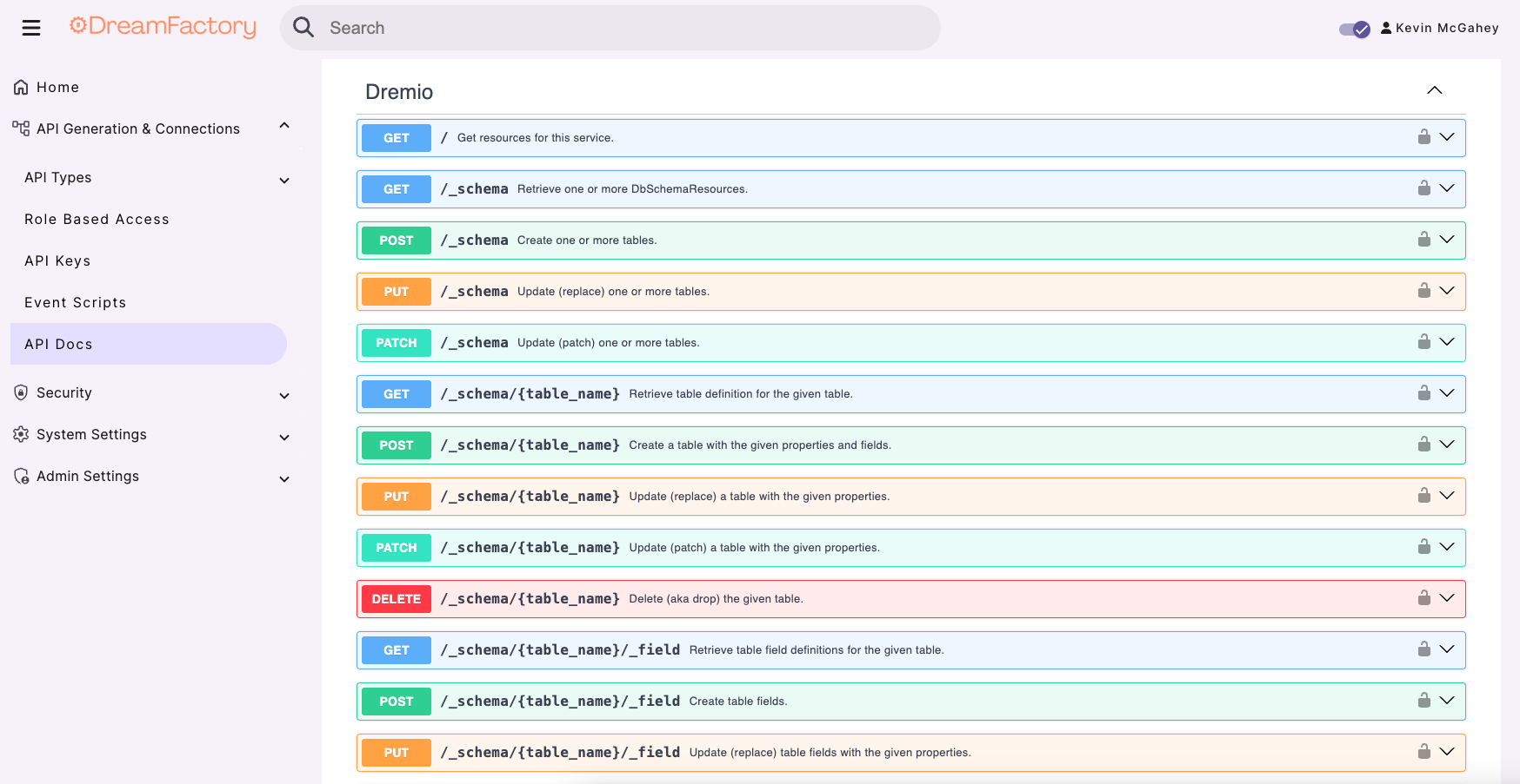 DreamFactory’s Dremio connector enables rapid, secure REST API generation for various databases, complete with documentation.