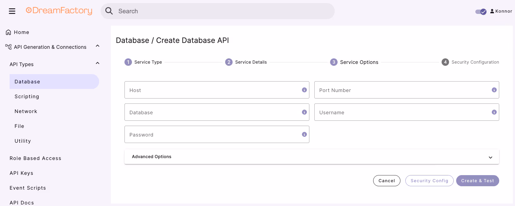 To commence generating your Firebird REST API, you’ll login to the DreamFactory administration interface, navigate to API Generation & Connections and then enter the service creation interface by clicking on the Database dropdown button under the API Types submenu.