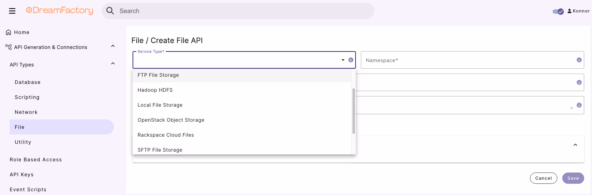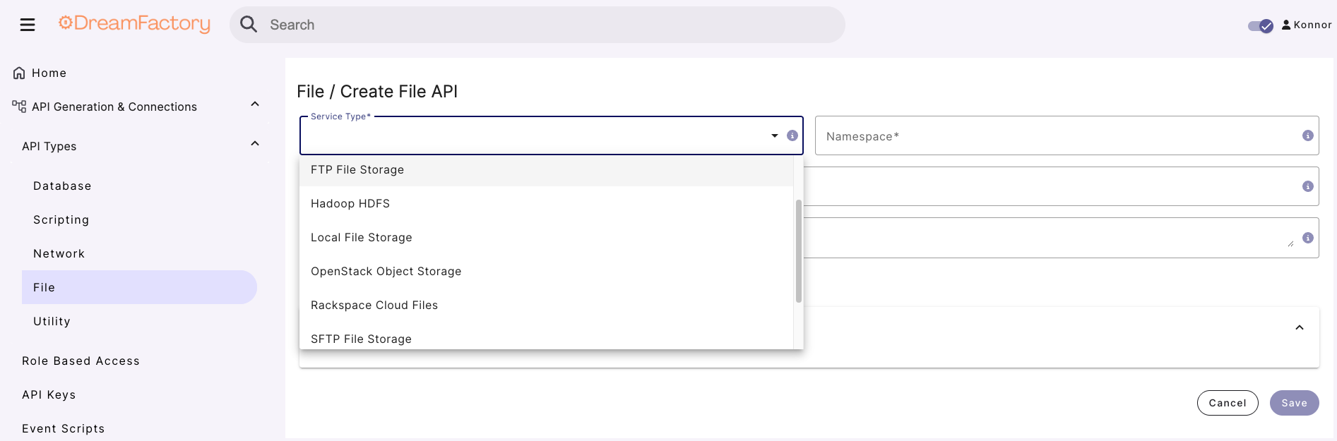 To start generating your FTP/SFTP REST API, you’ll login to the DreamFactory administration interface, navigate to the side bar and select the API Connections tab. From there, select API types, then from that dropdown select File.