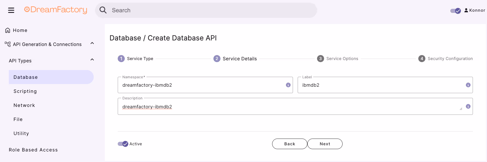 To commence generating your IBM DB2 REST API, you’ll login to the DreamFactory administration interface, navigate to API Generation & Connections and then enter the service creation interface by clicking on the Database dropdown button under the API Types submenu.