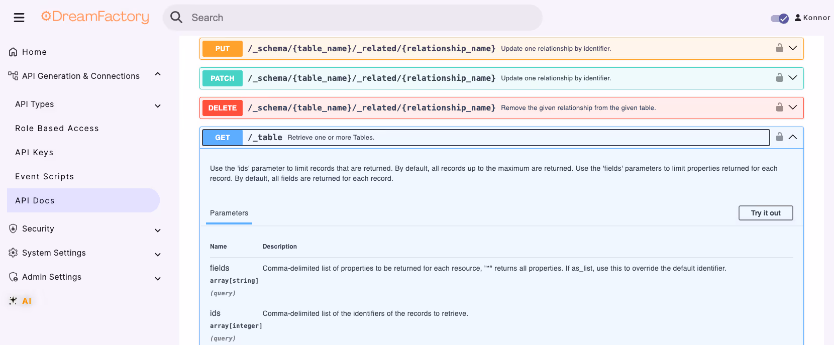 DreamFactory provides robust API documentation capabilities, automatically generating comprehensive, interactive API docs for every generated API.
