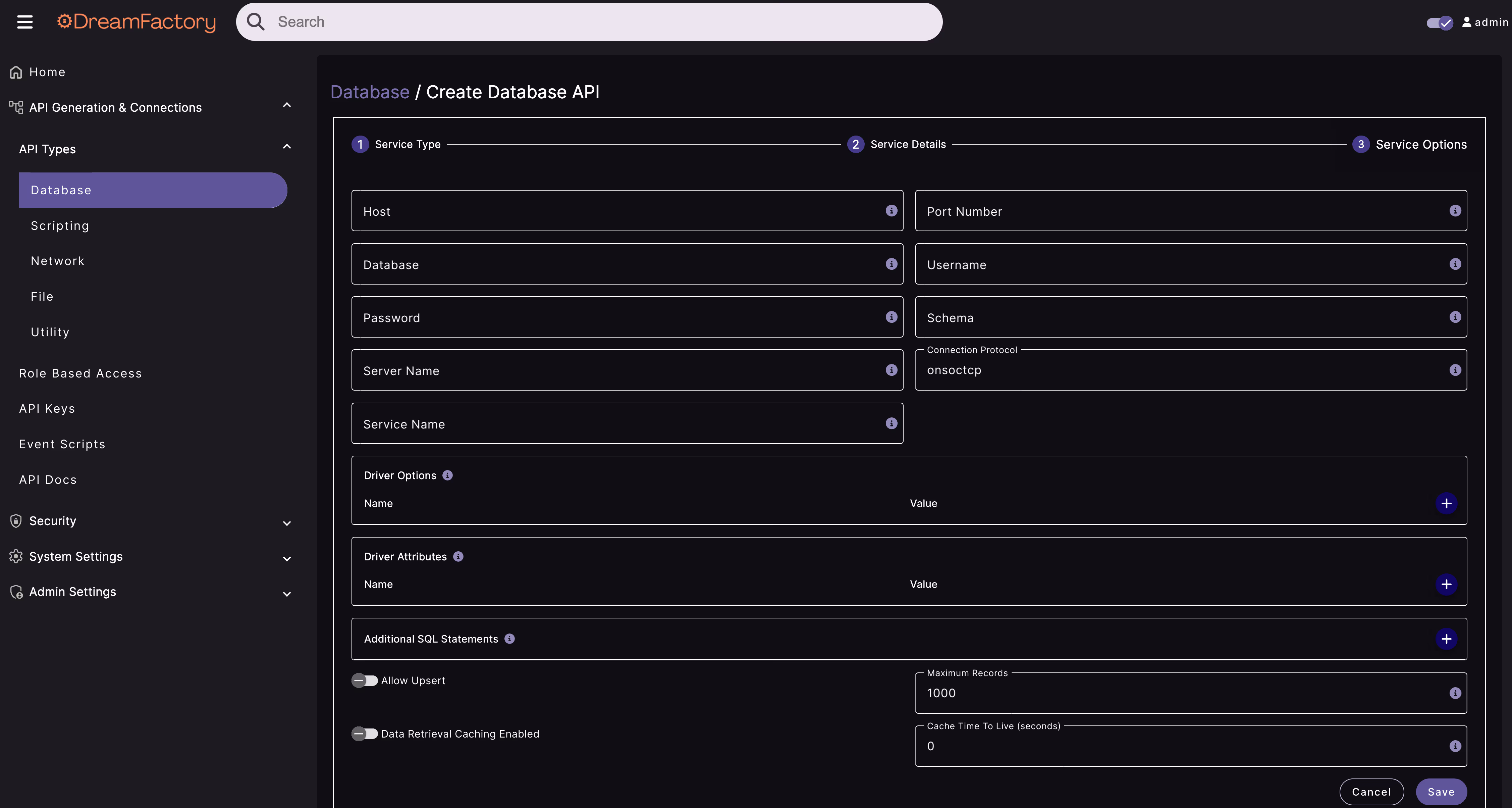 To commence generating your IBM Informix REST API, you’ll login to the DreamFactory administration interface, navigate to API Generation & Connections and then enter the service creation interface by clicking on the Database dropdown button under the API Types submenu.