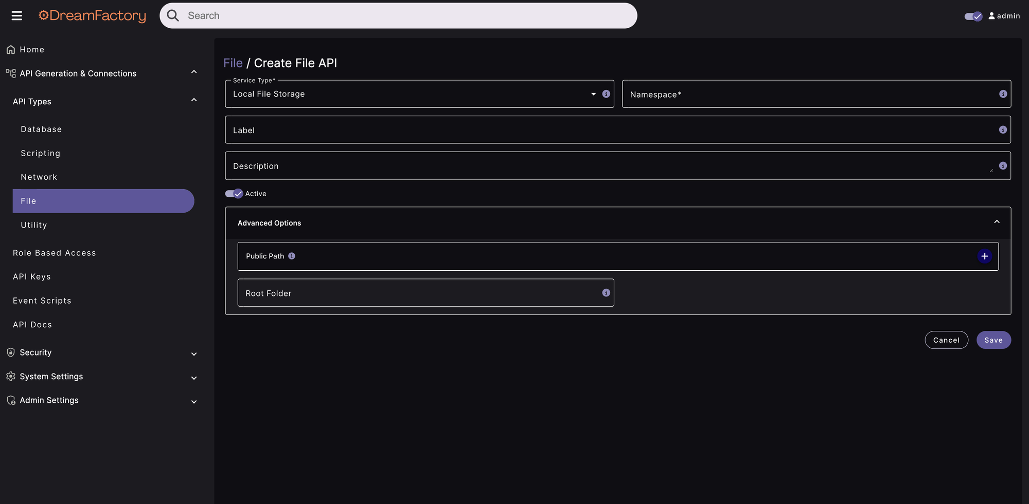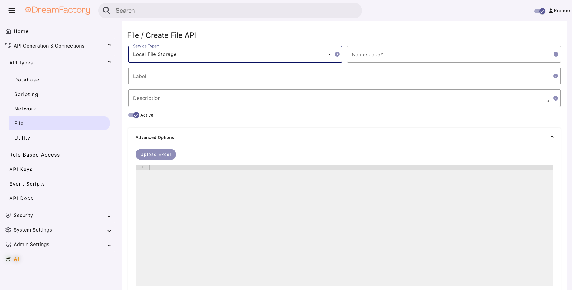 To commence generating your Local Storage REST API, you’ll login to the DreamFactory administration interface, navigate to API Generation & Connections and then enter the service creation interface by clicking on the File dropdown button under the API Types submenu.