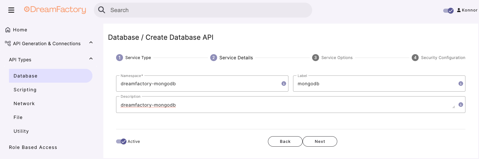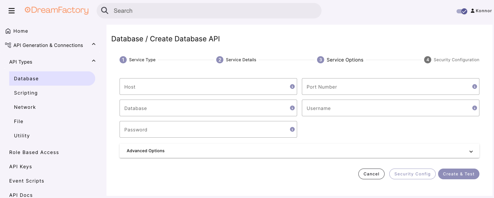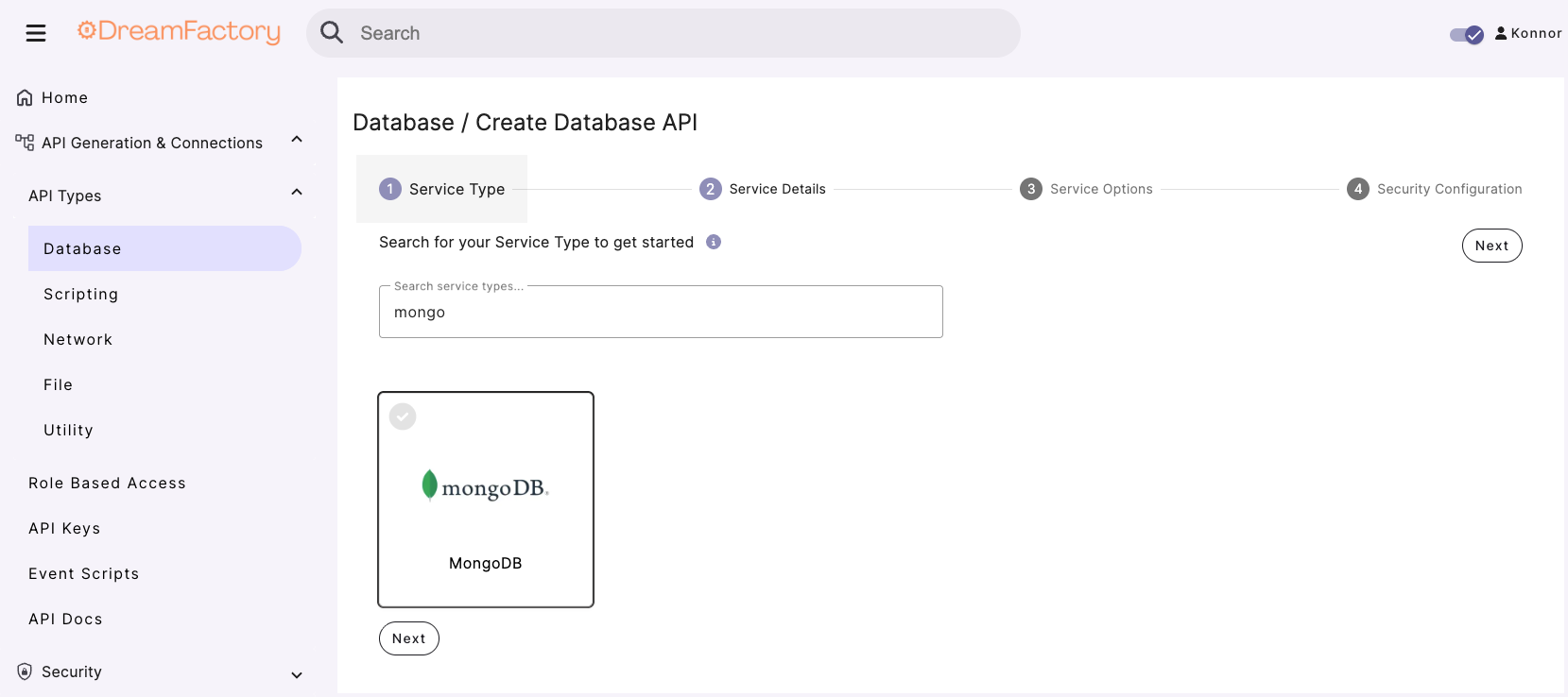 To commence generating your MongoDB REST API, you’ll login to the DreamFactory administration interface, navigate to API Generation & Connections and then enter the service creation interface by clicking on the Database dropdown button under the API Types submenu.