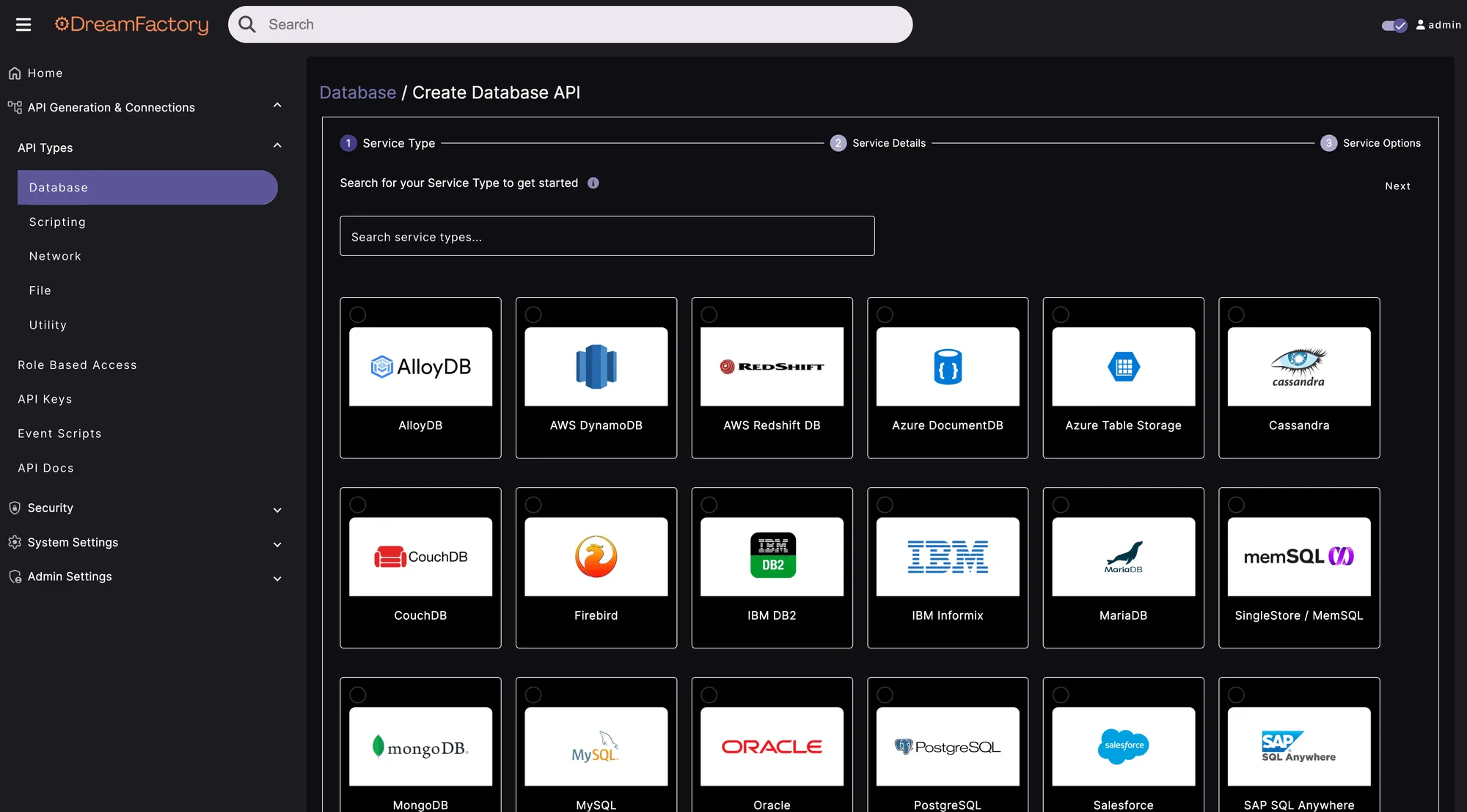 To commence generating your SingleStore/MemSQL REST API, you’ll login to the DreamFactory administration interface, navigate to API Generation & Connections and then enter the service creation interface by clicking on the Database dropdown button under the API Types submenu.